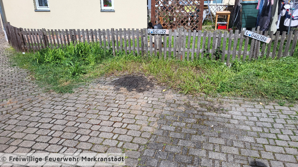 Die eintreffenden Einsatzkräfte fanden einen ca. 1m² großen Ölfleck vor. Dieser wurde mit Bindemittel abgestumpft und die Einsatzstelle an die Polizeibehörde übergeben. Im Anschluss fuhren die Einsatzkräfte das Gerätehaus wieder an.