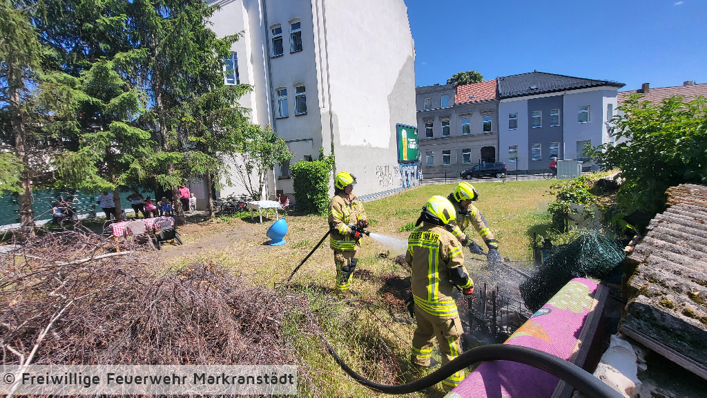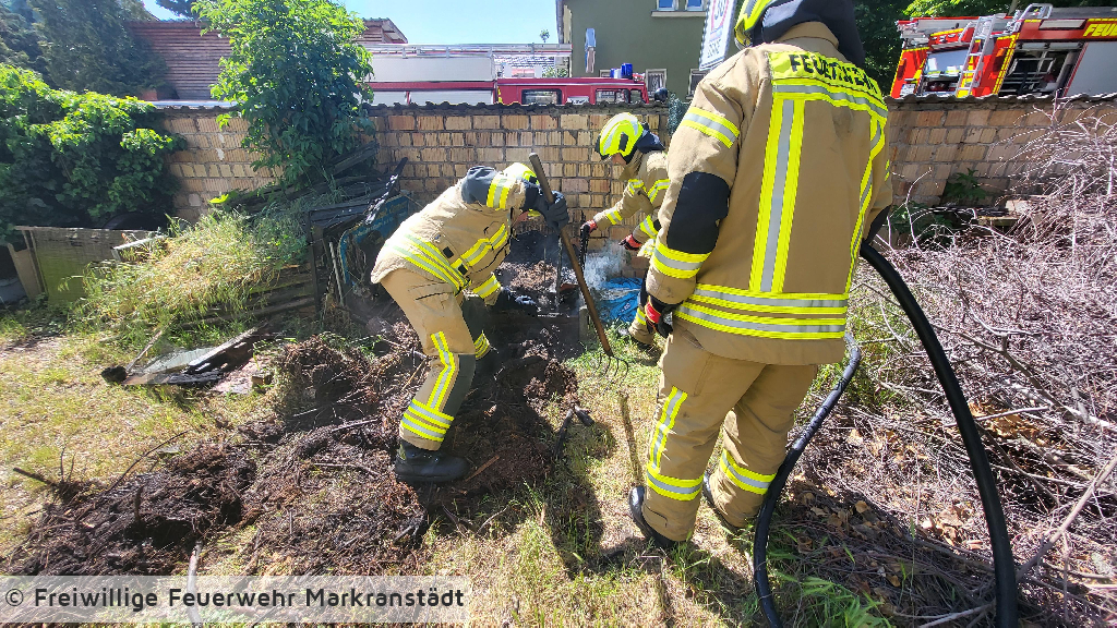 Vor Ort bestätigte sich die Alarmmeldung. Auf Grund von unsachgemäßem Umgang kam es im Garten zum Brand eines Komposthaufens. Durch den zügigen Eingriff der Feuerwehr mit der Schnellangriffseinrichtung des HLF konnte ein größer Brand verhindert werden.