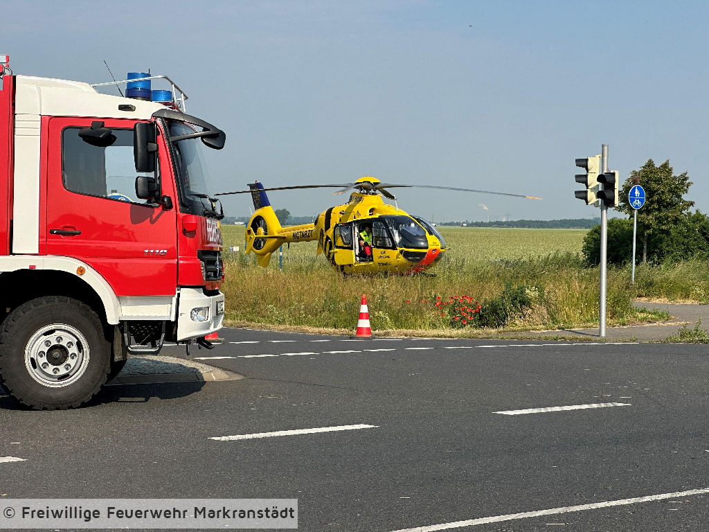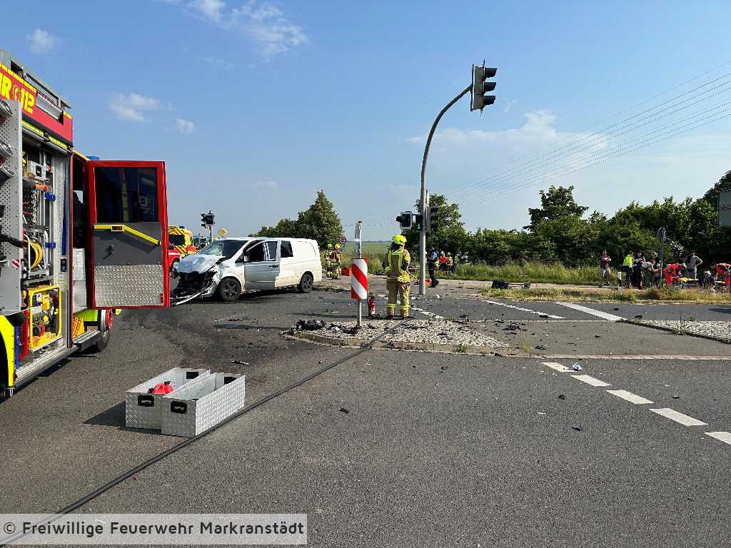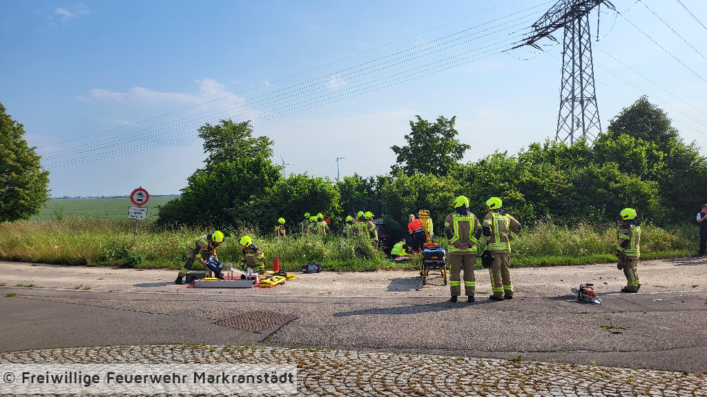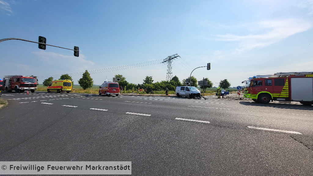 Beim Eintreffen an der Einsatzstelle bestätigte sich die Alarmmeldung. Aus ungeklärten Gründen stießen zwei PKW auf der Kreuzung zusammen, wobei einer der beiden PKW auf dem angrenzenden Grünstreifen zum stehen kam. Beide verletzten Personen wurden von Ersthelfern betreut, wovon sich eine Person eigenständig aus seinem Fahrzeug befreien konnte. Nach Absprache mit dem Rettungsdienst konnte die zweite Person durch eine technische Rettung patientenorientiert aus seinem Fahrzeug befreit werden. Im Anschluss wurden die Fahrzeuge noch stromlos geschalten und auslaufende Betriebsstoffe aufgefangen.