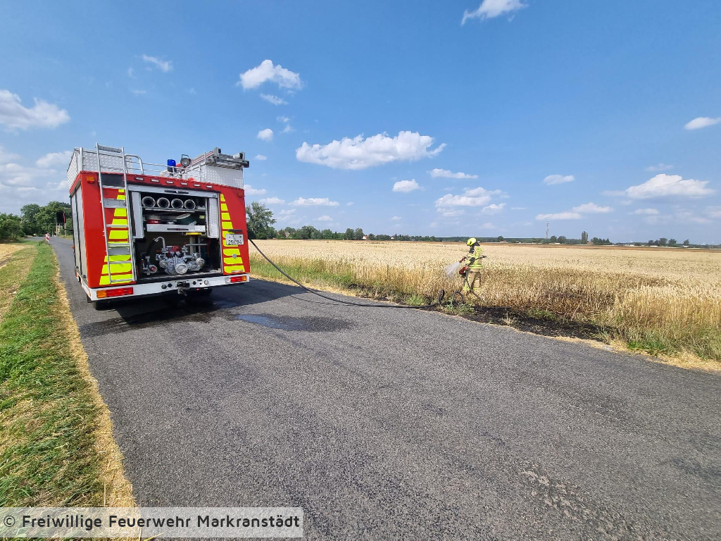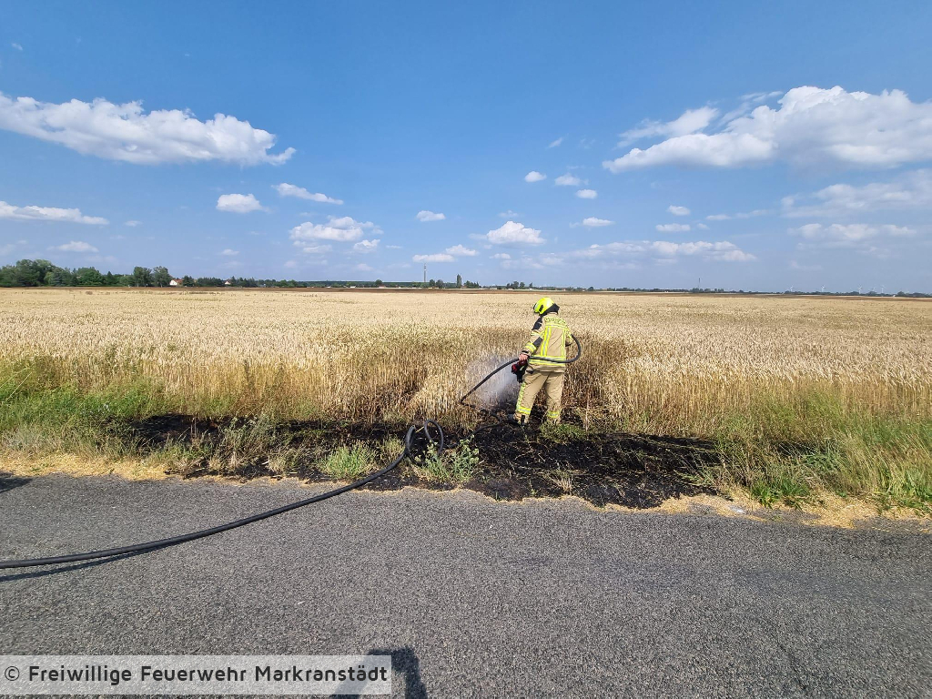 Durch das schnelle Handeln des ersteintreffenden Löschfahrzeuges konnte ein größerer Feldbrand verhindert werden. Die Kameradinnen und Kameraden löschten die ca. 25m² Feldbrand mittels Schnellangriffseinrichtung.
