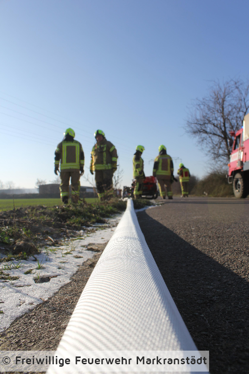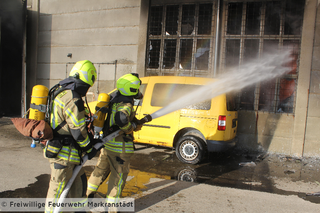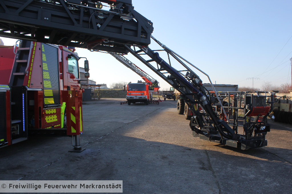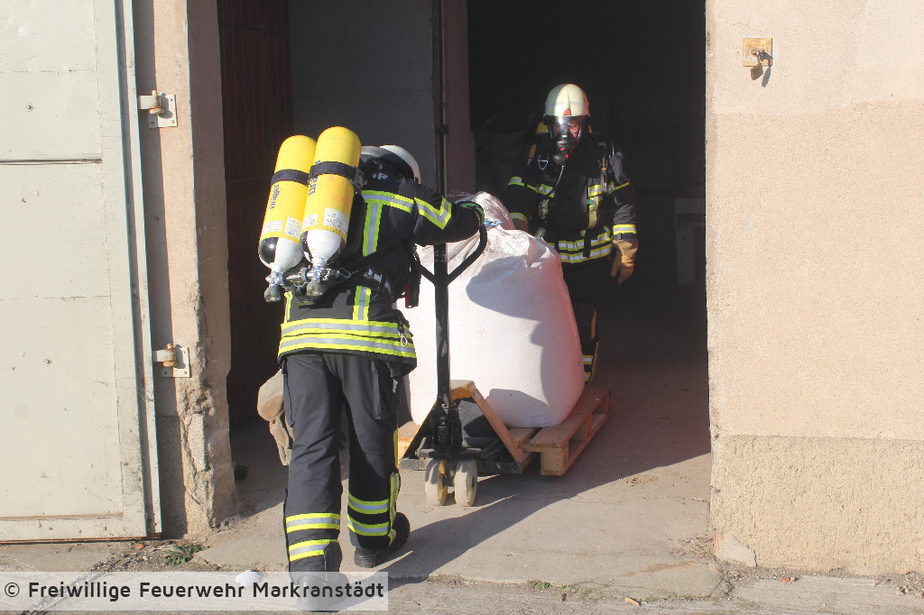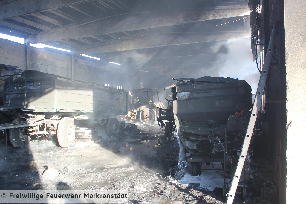 In der Spitze waren 6 Rohre im Einsatz. Davon 4 C-Rohre im Innenangriff und 2 Rohre über die Drehleitern der Feuerwehren Markranstädt und Böhlitz-Ehrenberg als Riegelstellung. In der Halle brannten ein Mähdrescher, 2 Traktoren, 1 PKW sowie diverse Anbaugeräte. Im angrenzenden Hallenteil waren verschiedene Düngemittel in Bigpacks gelagert. Diese wurden von den Einsatzkräften in Sicherheit gebracht.