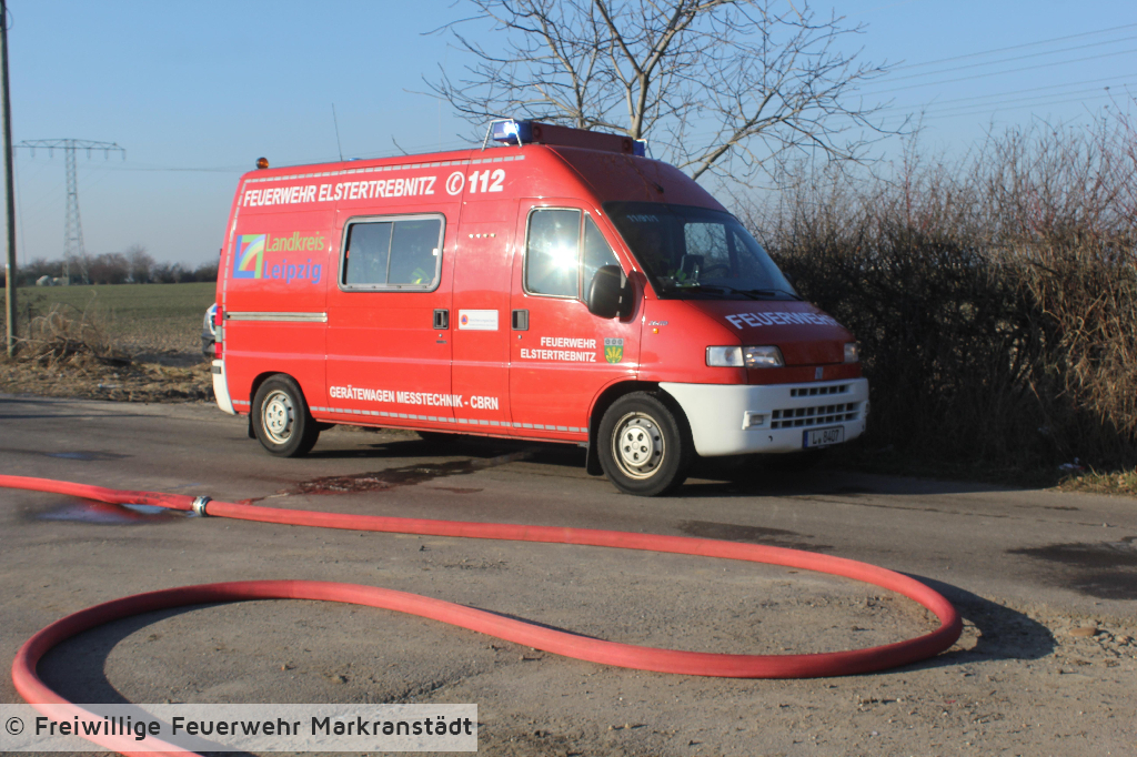 Aufgrund der starken Rauchentwicklung führte das Erkundungsfahrzeug der Feuerwehr Elstertrebnitz verschiedene Messungen in der Umgebung durch. Diese konnten glücklicherweise "ohne Befund" ausgewertet werden.