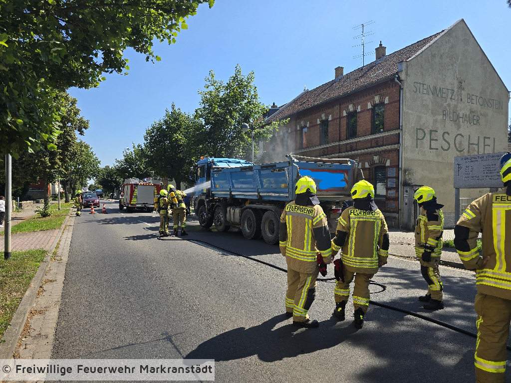 Beim Eintreffen an der Einsatzstelle, hatte der Fahrzeugführer den Brand an seinem LKW bereits gelöscht. Die Kameradinnen und Kameraden kontrollierten den Bereich und kühlten ihn im Anschluss mit Wasser noch etwas herunter.