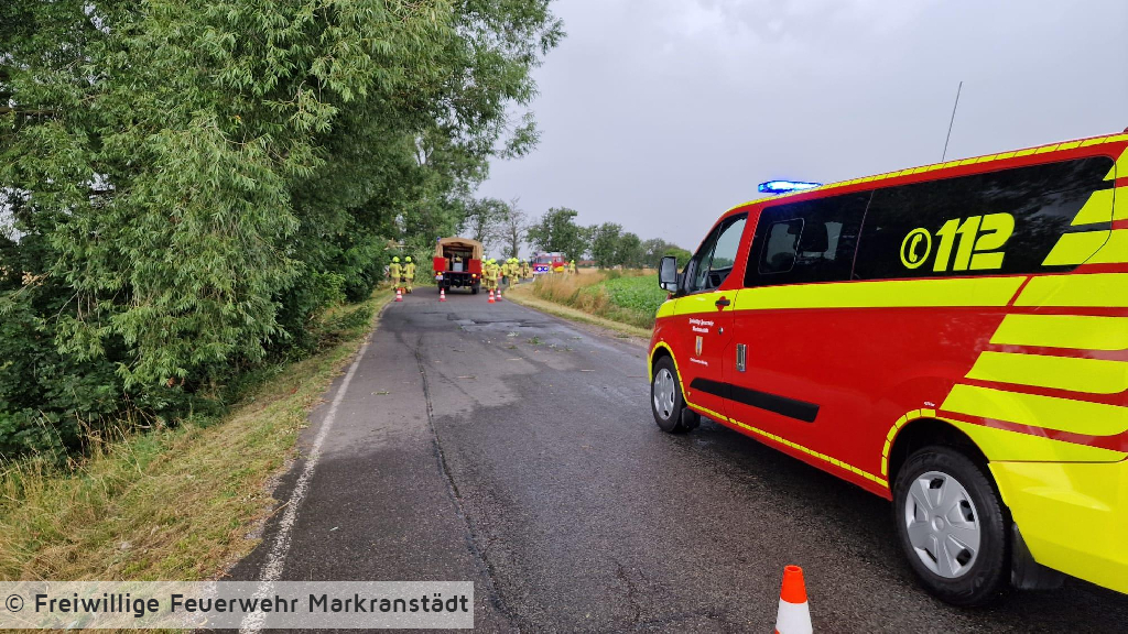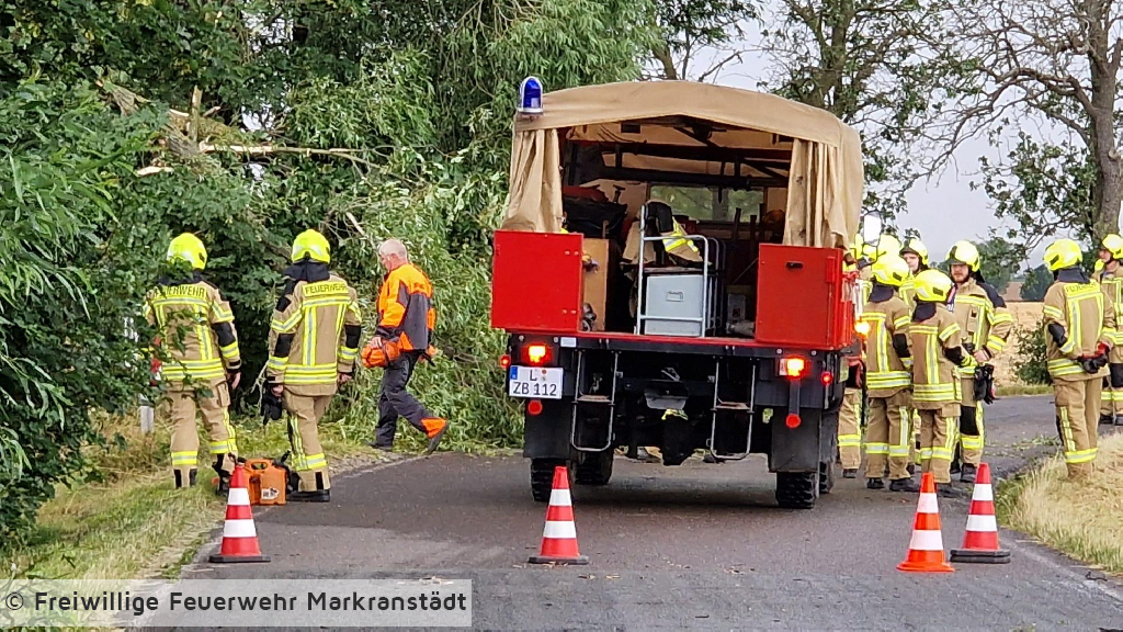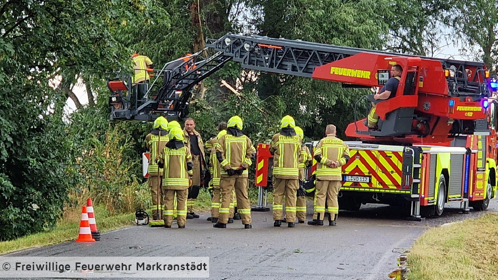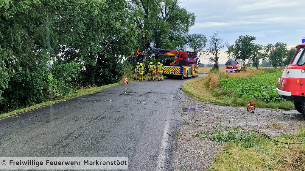 An der Einsatzstelle eingetroffen bestätigte sich die Alarmmeldung. Ein abgebrochener Baum behinderte den Straßenverkehr. Unter zu Hilfenahme zweier Kettensägen und der Drehleiter wurde der Baum abgetragen und im Anschluss von der Straße beräumt.
