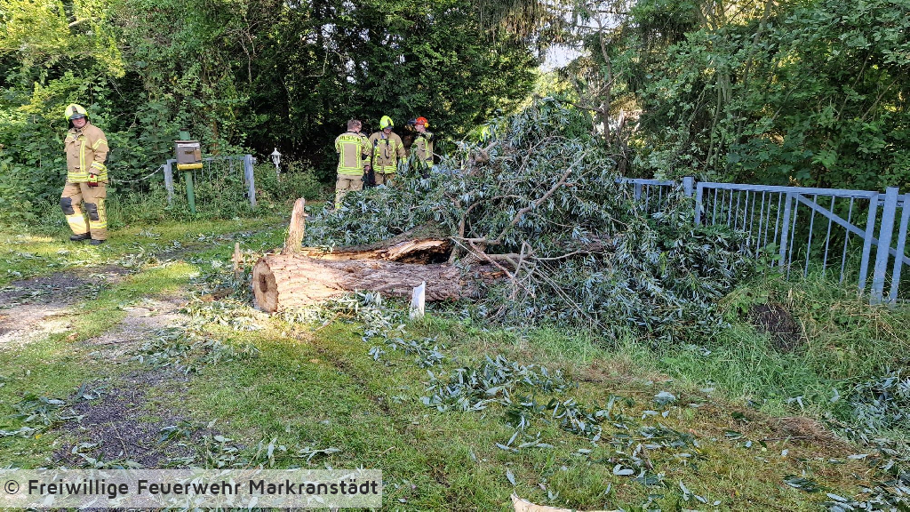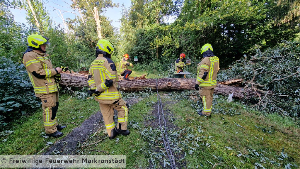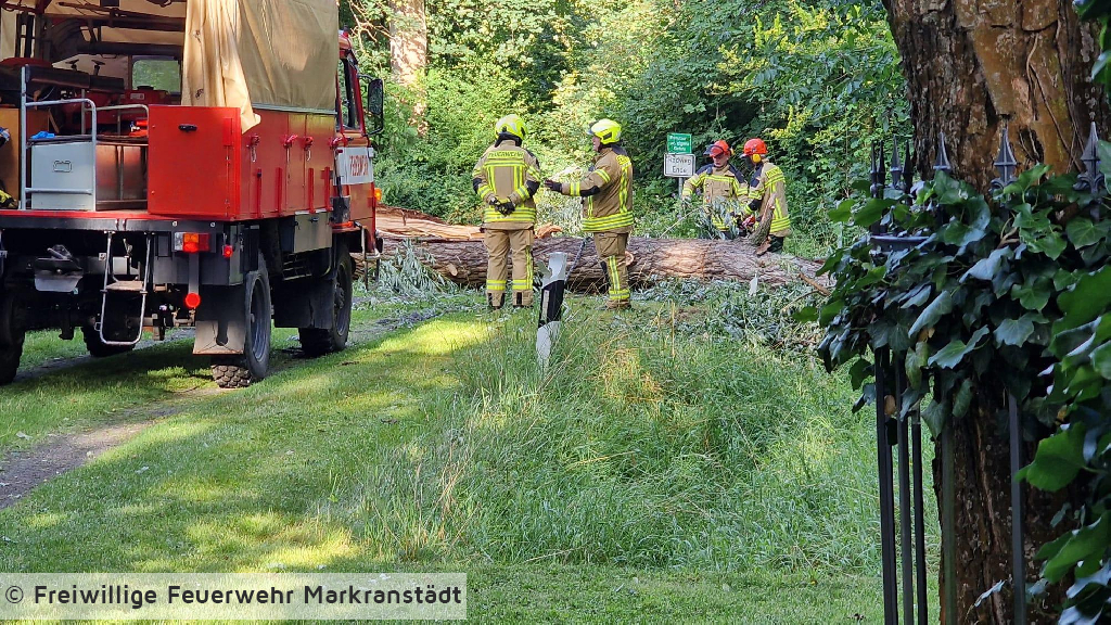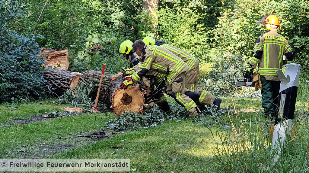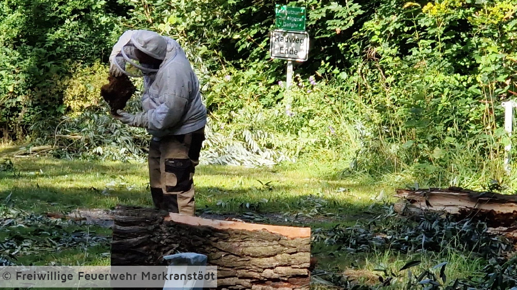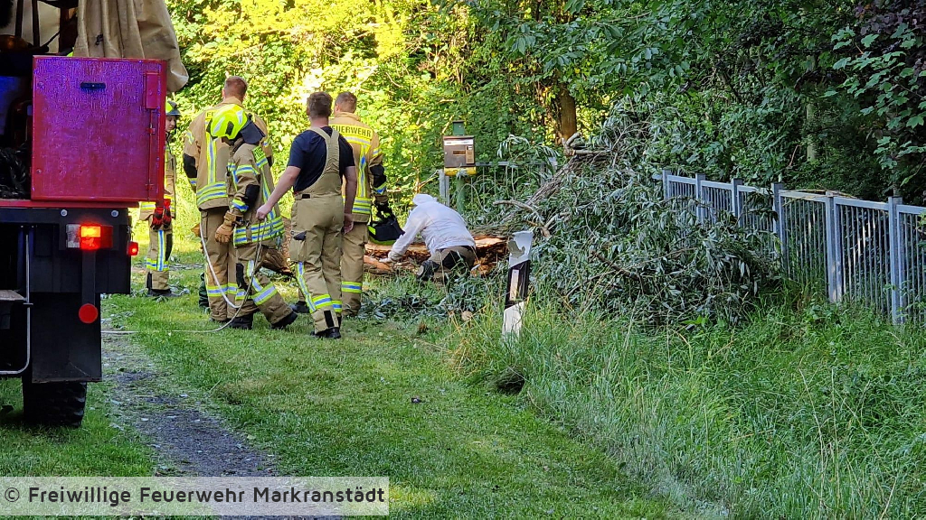 An der Einsatzstelle eingetroffen bestätigte sich die Alarmmeldung. Ein umgestürzter Baum blockierte die Fahrbahn. Mit zwei Kettensägen wurde der Baum zerkleinert und von der Fahrbahn geräumt. Während des Einsatzes offenbarte sich ein im Baum befindliches Bienennest. Mit der Unterstützung eines ortsansässigen Imkers wurde das Nest gesichert und an einen geschützten Platz umgesiedelt.