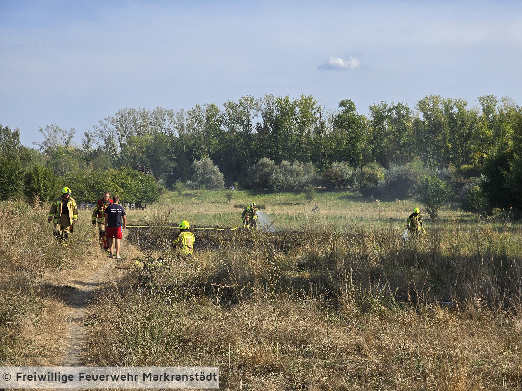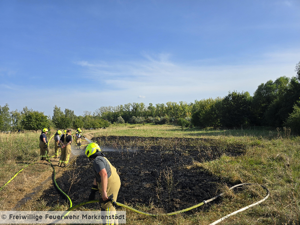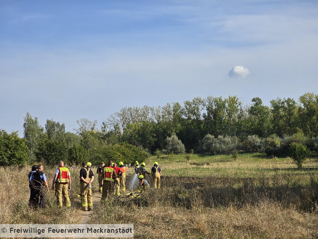 Die eintreffenden Einsatzkräfte fanden einen ca. 200m² großen Flächenbrand am Kulkwitzer See vor. Durch das umsichtige Handeln von Polizei und der Wasserwacht, die bereits mit Handfeuerlöschern eine Brandbekämpfung durchführten, konnte ein weiteres Ausbreiten eingedämmt werden. Umgehend begannen die Kameradinnen und Kameraden mit zwei C-Rohren mit der Brandbekämpfung und konnten zeitnah "Feuer aus" melden.