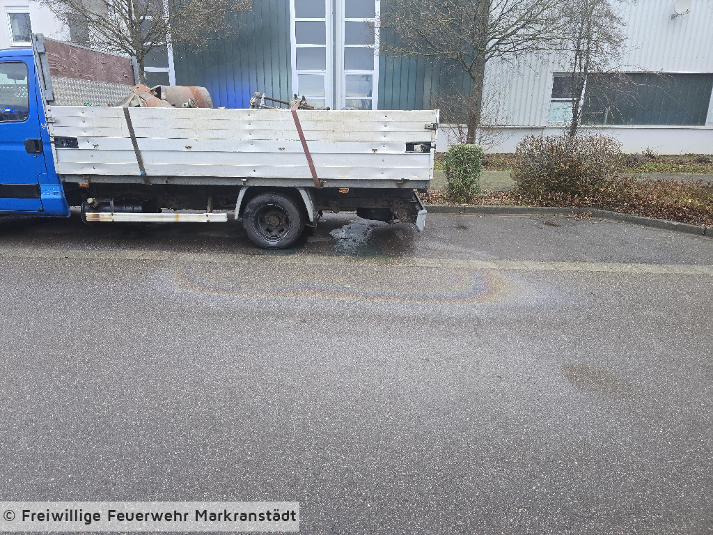 Die Einsatzkräfte wurden zu ausgelaufenem Öl bzw. Diesel aus einem LKW alarmiert. Die Kameradinnen und Kameraden fanden einen Transporter an der gemeldeten Einsatzstelle vor. Bei diesem liefen aufgrund der Lagerung von alten Motorenteilen größere Mengen Öl von der Ladefläche. Das Öl was sich nun auf der Straße verteilte wurde durch die Einsatzkräfte gebunden und zur entgültigen Reinigung eine Fachfirma hinzugezogen.