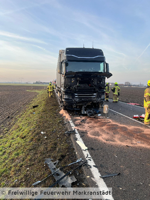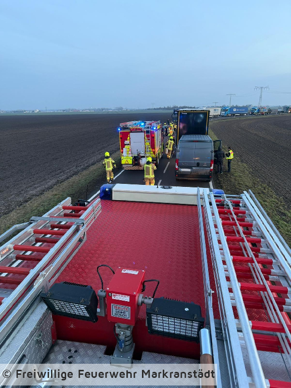 Am heutigen Tag wurde die Feuerwehr zu einem schweren Verkehrsunfall zwischen einem PKW und einem LKW alarmiert. Bereits auf der Anfahrt erhielten die Einsatzkräfte die Meldung, dass eine Person im PKW eingeklemmt sei. Beim Eintreffen an der Einsatzstelle bestätigte sich die Lage. Die eingeklemmte Person war nicht ansprechbar, sodass umgehend eine sogenannte Sofortrettung eingeleitet wurde. Parallel zur technischen Rettung aus dem Fahrzeug wurde die medizinische Erstversorgung vorbereitet. Die Feuerwehr befreite die Person schnellstmöglich aus dem PKW und begann unmittelbar mit der Versorgung des Patienten bis zum Eintreffen des Rettungsdienstes. Nach Übergabe an den Rettungsdienst unterstützten die Einsatzkräfte weiterhin bei der Reanimation. Trotz aller Bemühungen verstarb die betroffene Person noch an der Einsatzstelle. Neben der Menschenrettung wurden durch die Feuerwehr weitere Sicherungsmaßnahmen durchgeführt. Die Einsatzstelle wurde umfassend abgesichert, der Brandschutz sichergestellt sowie beide Fahrzeuge stromlos geschaltet. Auslaufende Betriebsstoffe wurden abgestreut und gebunden, um Umweltschäden zu vermeiden. Nach Abschluss der Maßnahmen wurde die Einsatzstelle an den Unfalldienst der Polizei übergeben. Die Feuerwehr konnte anschließend wieder in das Gerätehaus einrücken.