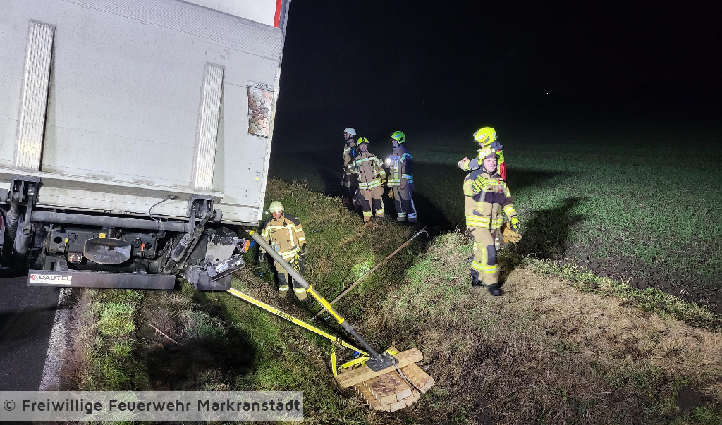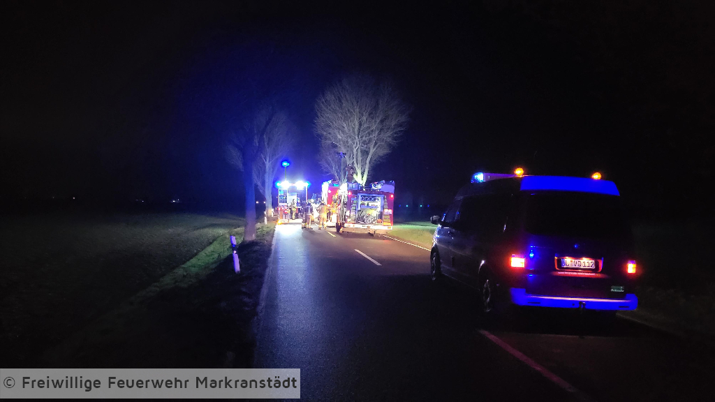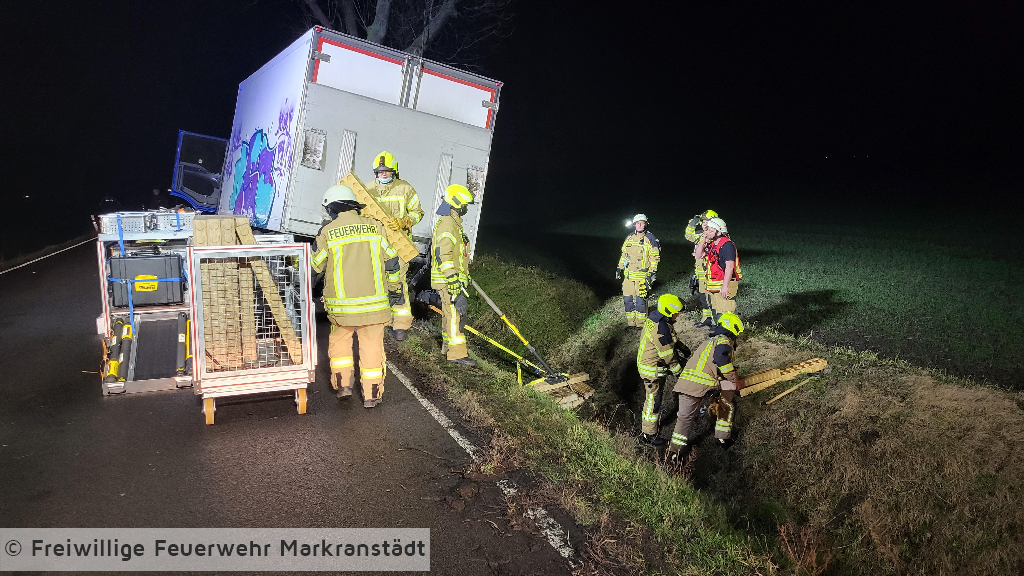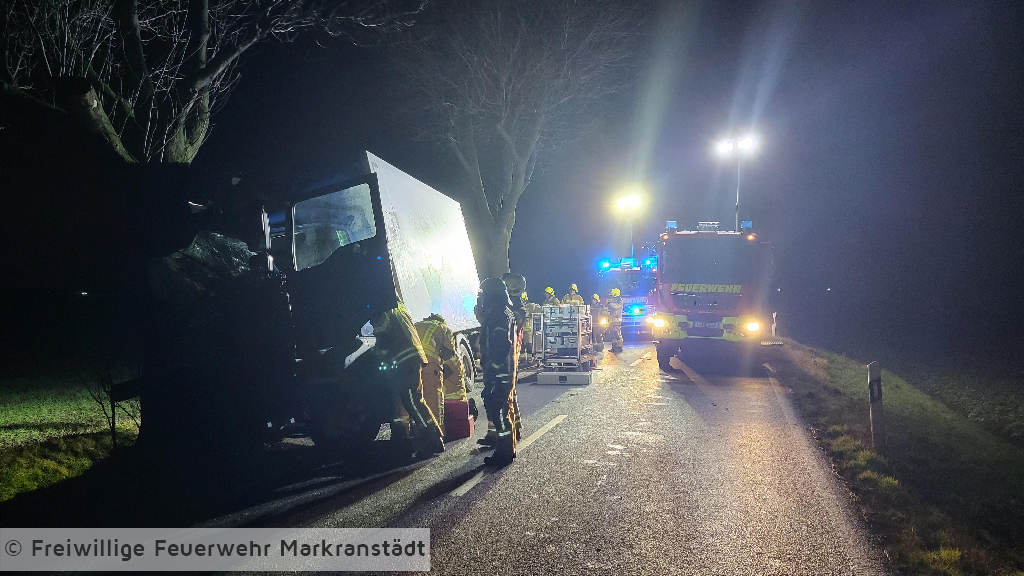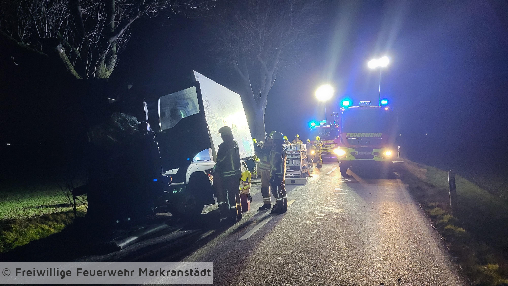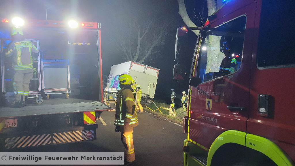 Beim Eintreffen an der Einsatzstelle bestätigte sich die Alarmmeldung. Ein LKW war aus ungeklärter Ursache mit einem Baum kollidiert. Der Fahrer konnte sich selbst aus seinem Fahrzeug befreien und wurde bereits vom Rettungsdienst versorgt. Die Kameradinnen und Kameraden sicherten das Fahrzeug, schalteten es stromlos und kontrollierten die Ladung. Im Anschluss wurde die Einsatzstelle an die Polizei übergeben und alle Kräfte fuhren ihre Gerätehäuser wieder an.