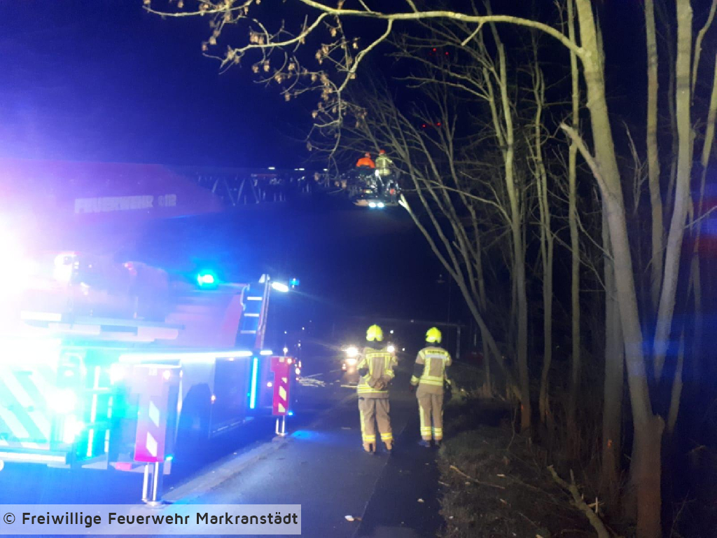 Beim Eintreffen der Einsatzkräfte bestätigte sich die Lagemeldung. Ein Baum lag auf der Straße, ein zweiter Baum drohte umzustürzten. Die Kameradinnen und Kameraden trugen den Baum über die Drehleiter ab und beräumten im Anschluss die Fahrbahn.