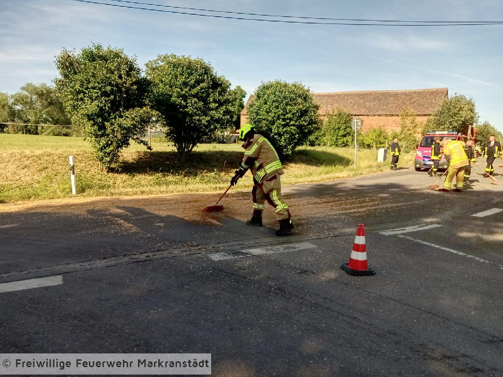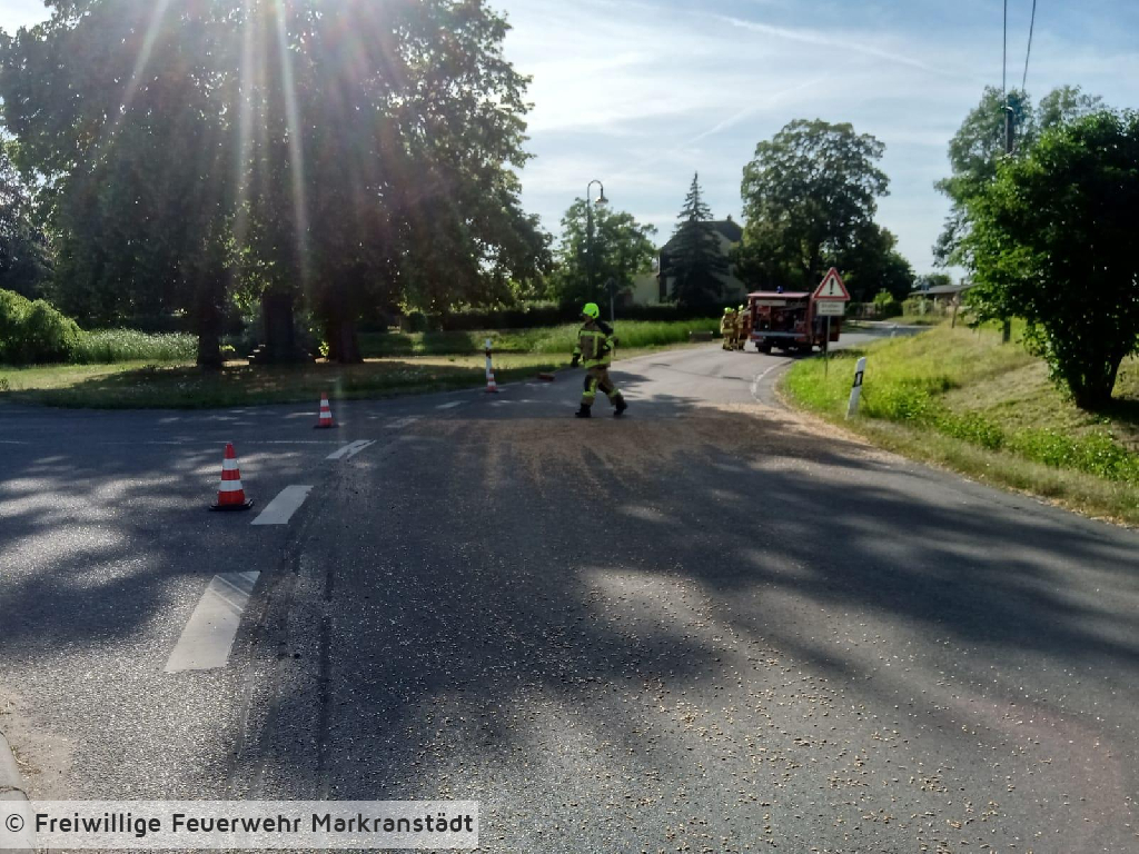 Die Ortsfeuerwehr Schkölen/Räpitz wurde zu einer größeren Menge Getreide auf der Fahrbahn alarmiert. Vor Ort bestätigte sich die Alarmmeldung. Die Kameradinnen und Kameraden sperrten die Straße und beseitigten das Getreide von der Fahrbahn. Nachdem die Straße gereinigt war, konnten die Einsatzkräfte ihr Gerätehaus wieder anfahren.