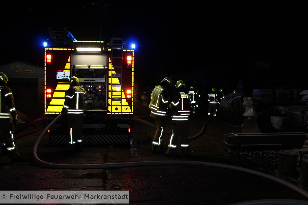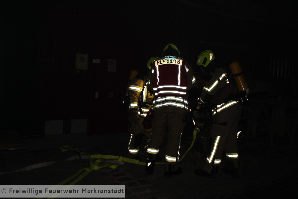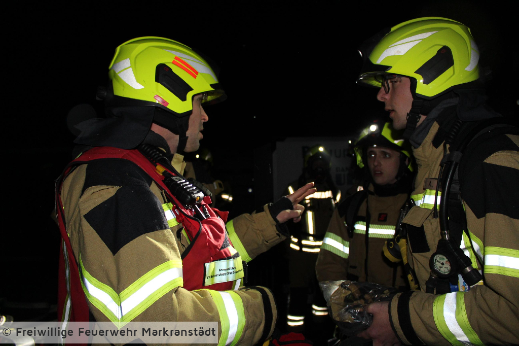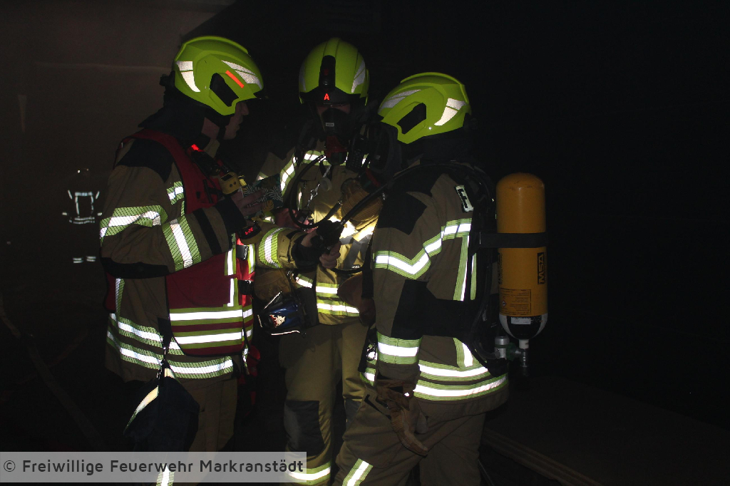 Das eher harmlose Einsatzstichwort wurde nach der ersten Lageerkundung schnell zu einem Gebäudebrand ausgeweitet. Denn die ersteintreffenden Kameradinnen und Kameraden fanden nicht nur einen brennenden Container sondern eine zusätzlich brennende Lagerhalle vor, in der 5 Personen eingeschlossen waren. Nachdem die ersten Maßnahmen zur Personenrettung und Brandbekämpfung eingeleitet wurden entspannte sich die Lage jedoch, als sich herausstellte, dass das Szenario anlässlich der turnusmäßigen Gemeindeverbandsübung inszeniert wurde. Dennoch galt es für die Kameradinnen und Kameraden ihr Wissen auf dem Gebiet der Brandbekämpfung anzuwenden und die eingeschlossenen Personen zu befreien. Wir bedanken uns ganz herzlich beim Bauteam Sauermann die uns ihr Firmengelände zur Verfügung gestellt haben. Dank gilt auch der Stadt Markranstädt für ihre Unterstützung, aber natürlich auch den Kameradinnen und Kameraden für die gezeigte Einsatzbereitschaft.
