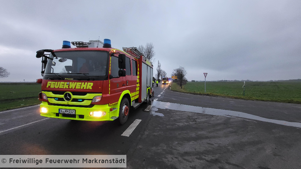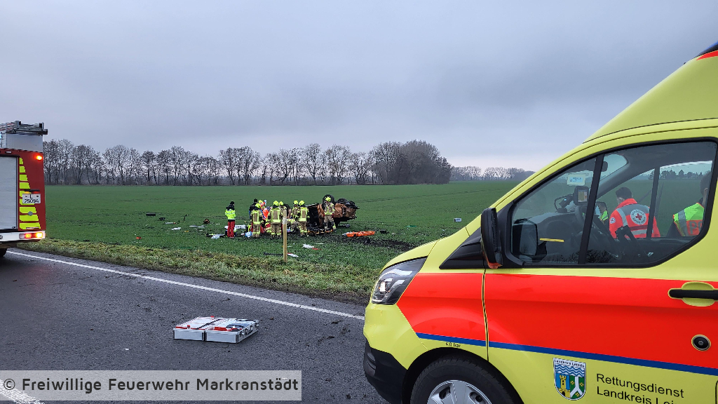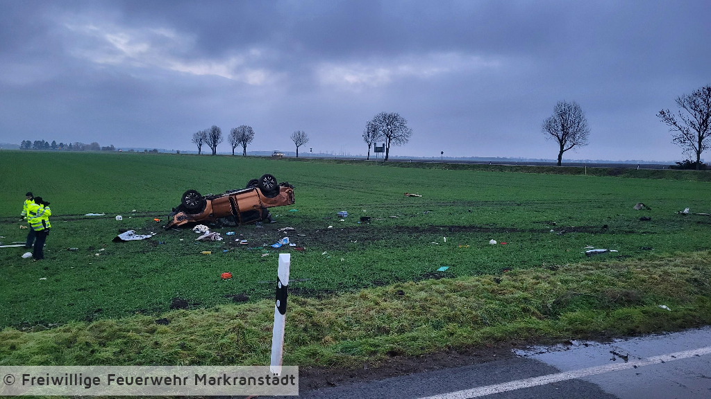 Zu einem schweren Verkehrsunfall wurden die Ortsfeuerwehren der Freiwilligen Feuerwehr Markranstädt alarmiert. Vor Ort fanden die Kameradinnen und Kameraden einen verunfallten PKW vor der aus ungeklärten Gründen von der Fahrbahn abkam und sich auf dem angrenzenden Feld überschlagen hatte. Der Fahrer wurde bereits von Ersthelfern aus seinem Fahrzeug befreit und vom Rettungsdienst versorgt. Wir unterstützten den Rettungsdienst bei der Versorgung der verletzten Person und sicherten die Einsatzstelle ab. Nachdem der Patitent in den Rettungswagen verbracht und ins Krankenhaus gefahren wurde, reinigten die Einsatzkräfte noch die Fahrbahn und fuhren dann ihre Gerätehäuser wieder an.