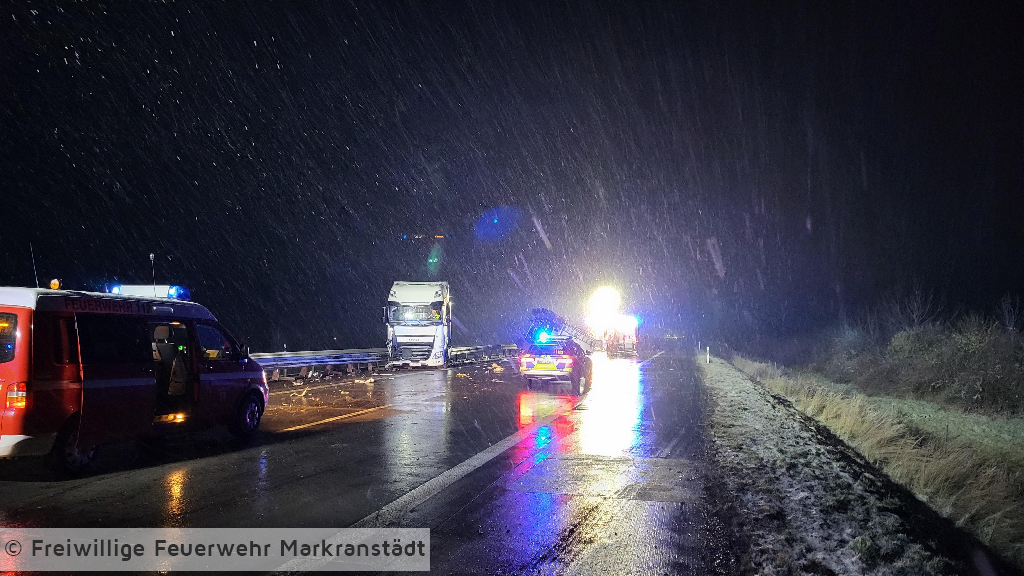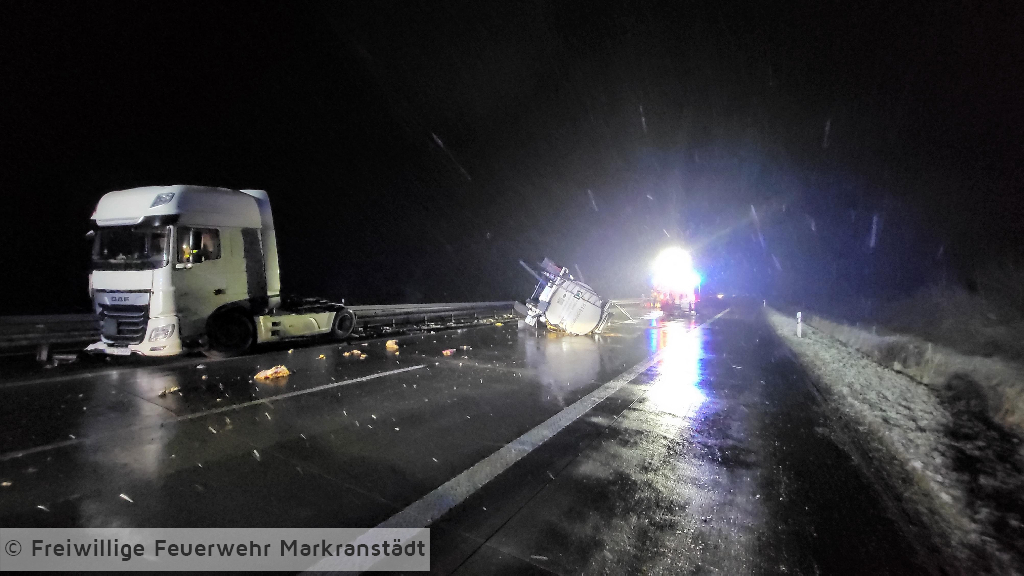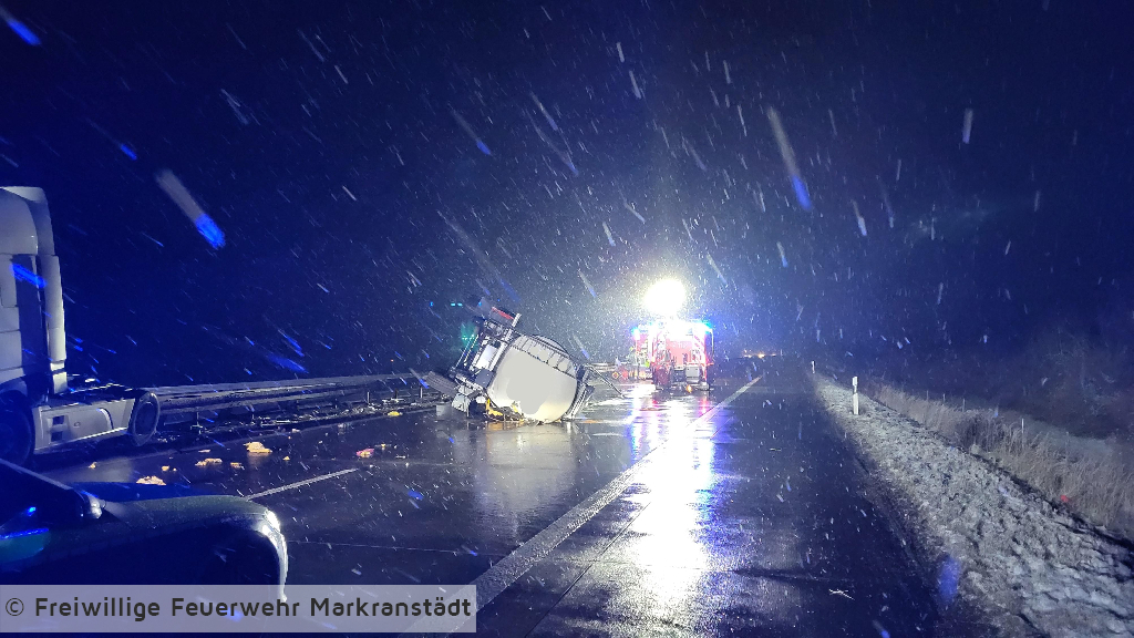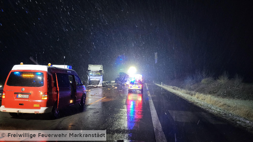 Gemeinsam mit der Berufsfeuerwehr Leipzig wurde die Feuerwehr Markranstädt zu einem LKW-Unfall auf die BAB 38 alarmiert. An der Einsatzstelle eingetroffen fanden die Einsatzkräfte einen verunfallten LKW vor bei dem sich der Auflieger von der Zugmaschine gelöst hatte und umgekippt auf beiden Fahrspuren lag. Die Kameradinnen und Kameraden sicherten die Einsatzstelle und dämmten augelaufene Flüssigkeiten ein. Nach dem Eintreffen eines Bergeunternehmens und weiteren Absprachen konnte die Einsatzstelle an die Polizei übergeben werden. Die Einsatzkräfte der Feuerwehren fuhren ihre Ausgangspunkte wieder an.