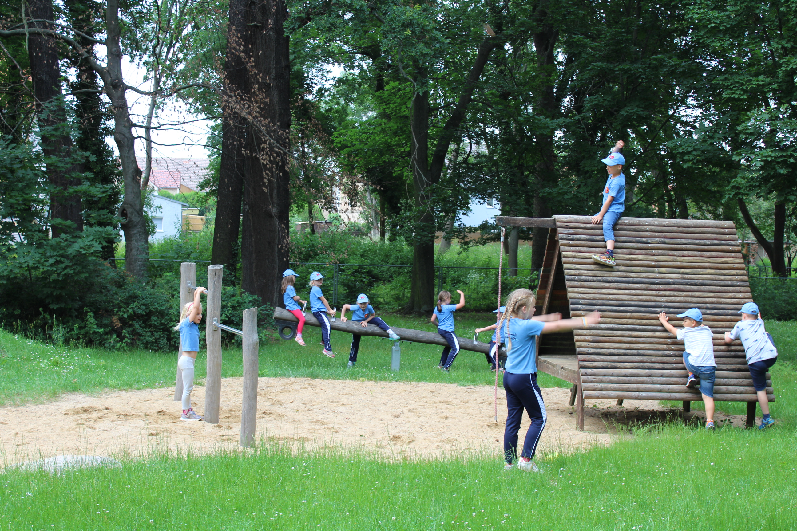 Nachdem Uta mit ihrem "eins, zwei, drei - alle Feuerwehrkinder schnell herbei" gerufen hatte, packten wir alle Reiseutensilien und auf ging es in Richtung Spielplatz in Quesitz. Doch die Kinderfeuerwehr wäre nicht die Kinderfeuerwehr, wenn da nicht zwischendurch ein paar Aufgaben zu bewältigen gewesen wären... und so galt es nach einem kurzen Marsch auf dem Kirchweg - durch einen Reifen zu klettern, als Menschenschlange rückwärts zu laufen oder im Slalom um einen Heuballen zu flitzen... Auf dem Spielplatz angekommen gab es natürlich wieder eine Stärkung und Zeit zum Toben, bevor die Fünkchen den Rückweg nach Döhlen antraten...
