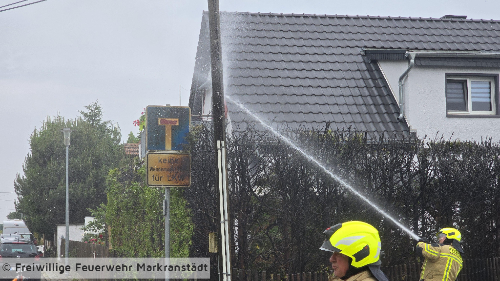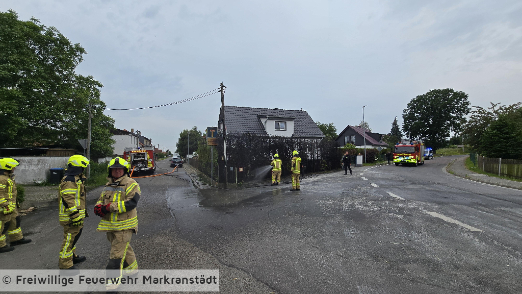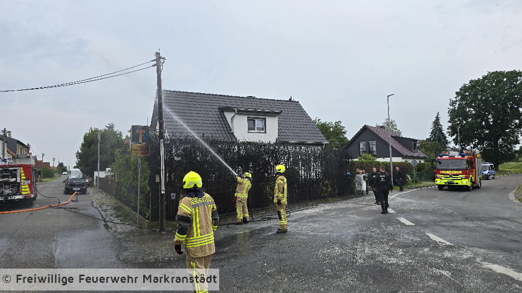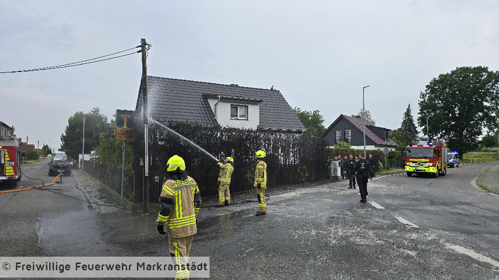Am 10.06.2025 wurde die Feuerwehr um 11:36 Uhr zu einem gemeldeten Brand von Unrat am Gebäude alarmiert. Bereits auf der Anfahrt bestätigte die ersteintreffende Einheit die Lage: Eine brennende Hecke unmittelbar an der Fassade eines Wohnhauses drohte auf das Gebäude überzugreifen. Durch das schnelle und gezielte Eingreifen der Einsatzkräfte konnte der Brand mittels Schnellangriffsleitung rasch unter Kontrolle gebracht und gelöscht werden.