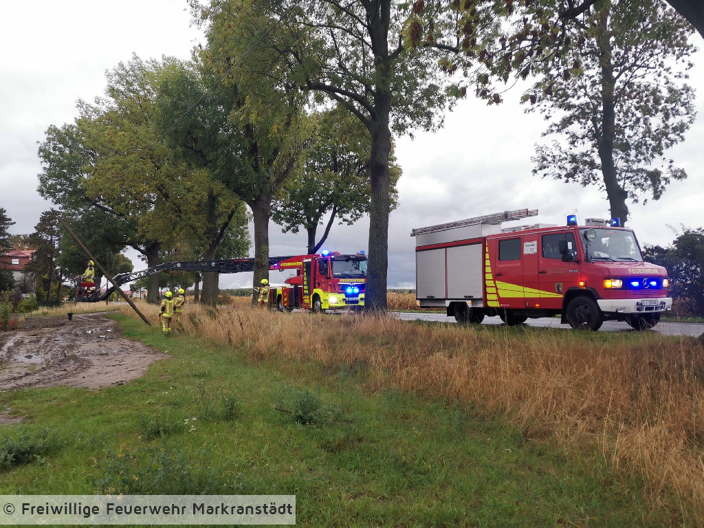 Am späten Samstagnachmittag wurde die Feuerwehr zu Sicherungsarbeiten alarmiert. Gegen 17:12 Uhr ging die Meldung ein, dass ein Telefonmast auf ein angrenzendes Feld zu kippen drohe. Nach erster Erkundung konnte kein Strommast festgestellt werden, woraufhin die Einsatzkräfte den betroffenen Bereich kontrollierten. Vor Ort bestätigte sich die Lage. Ein Telefonmast war stark geneigt und drohte umzustürzen. Zur Gefahrenbeseitigung wurde der zuständige Telefonnetzbetreiber informiert. Nach Rücksprache mit diesem und zur Sicherstellung der Verkehrssicherheit wurde der Mast kontrolliert zu Boden gebracht.